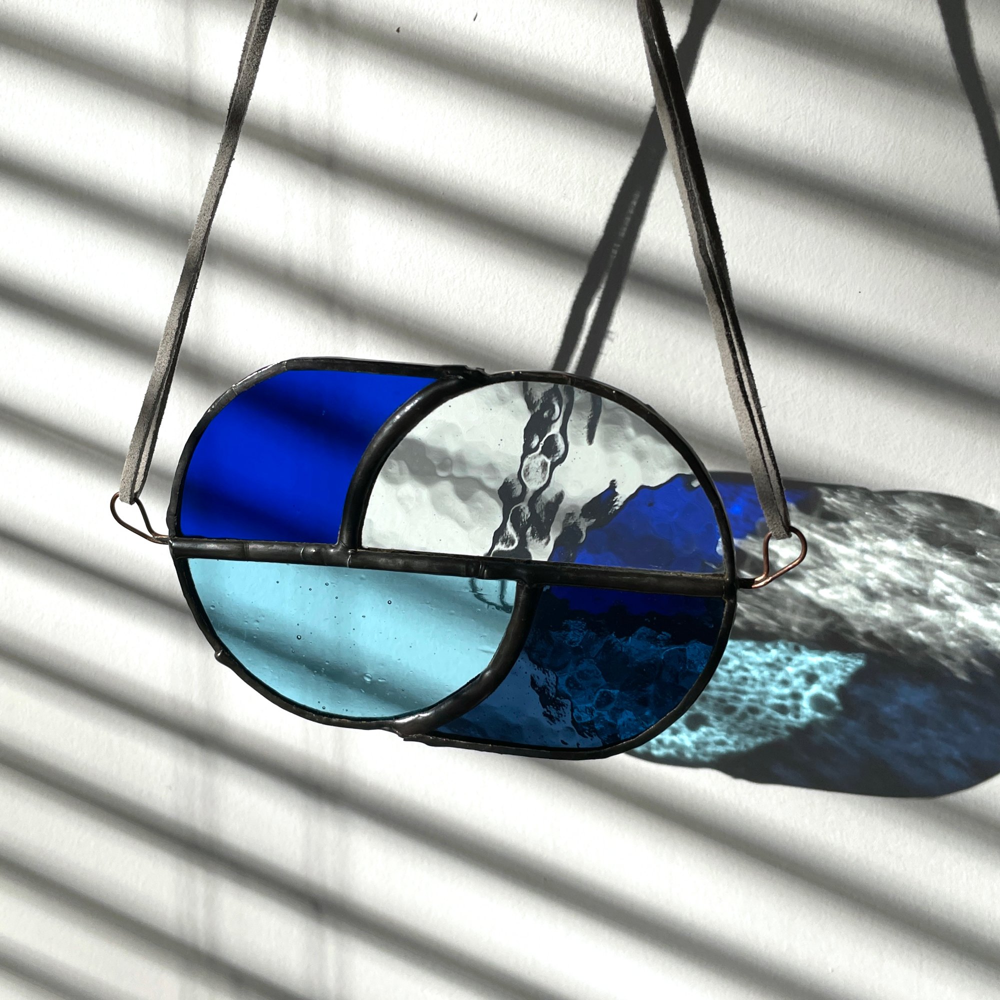 ▫️ Beautiful blues & textured clear glass ▫️ Dark coloured metalwork with 2 hanging loops ▫️ Around 12 x 8cm